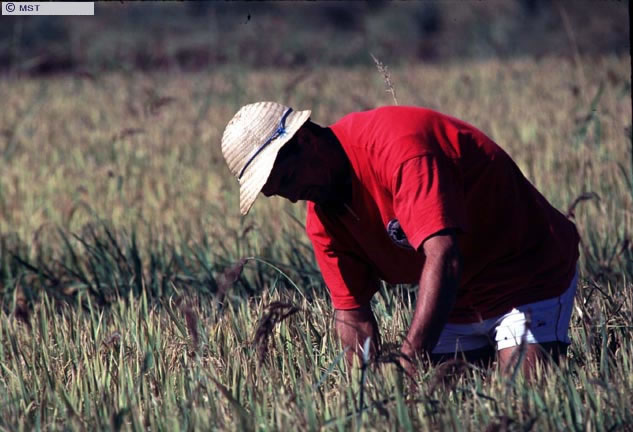 "Sem-Terra" colhendo arroz no assentamento Liberdade no Futuro, em Santana do Livramento, Rio Grande do Sul